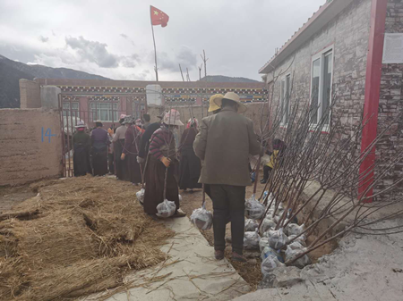 3月24日,苹果树苗以及肥料等配套物资到达更沙村,杨洁立即对物资进行分配,开始了为期9天苹果树种植和配套设施建设工作。